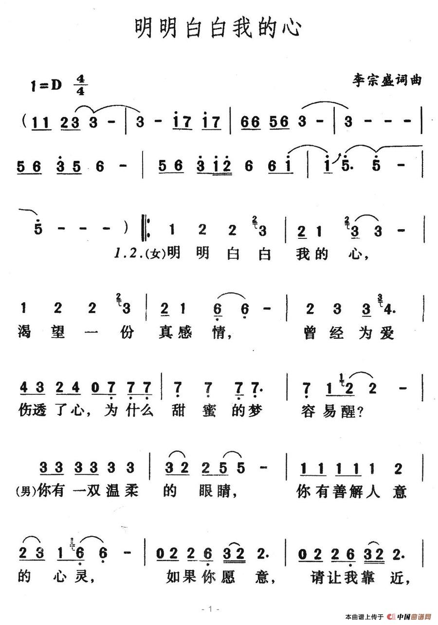 明明白白我的心简谱 通俗曲谱 中国曲谱网